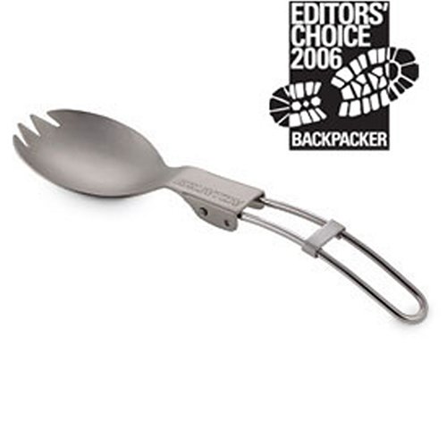 and this spork is definitely better than the cheap plastic folding spork included in the GSI Ultralight Soloist cookset, which is where i take advantage of this folding utensil's compacting feature... The Brunton My-Ti Folding Spork is the only eating utensil you need in the backcountry. This sporkboth spoon and forkis made of rugged, lightweight titanium and folds in half. Brunton's well-designed eating tool weighs less than an ounce and, because it folds, takes up almost no space in your backpack. Titanium doesn't rust or melt, and it won't make your food taste metallic.